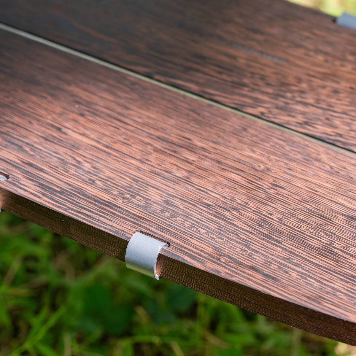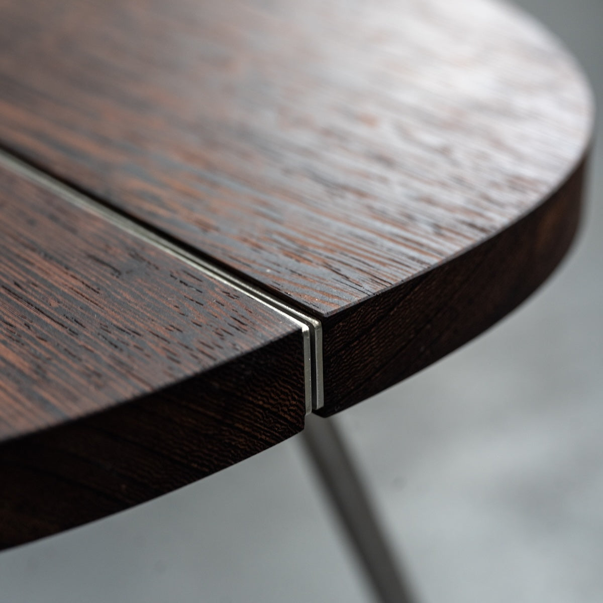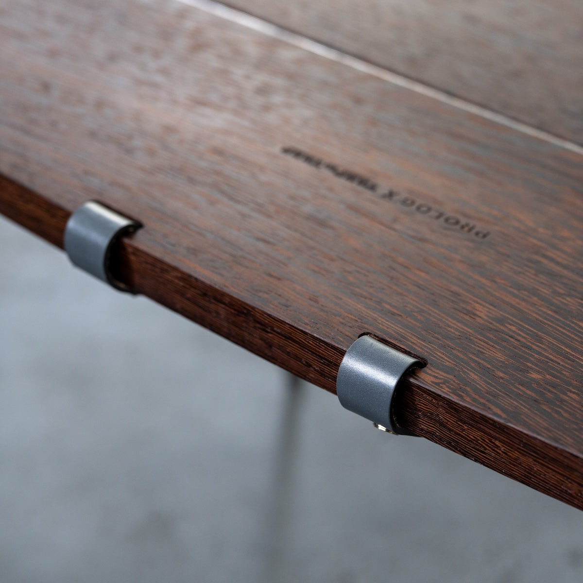 ブラックに近い、ダークブラウンの木と、ダークグレーのレザーパーツのコントラストがマッチした、美しいテーブルが完成しました。