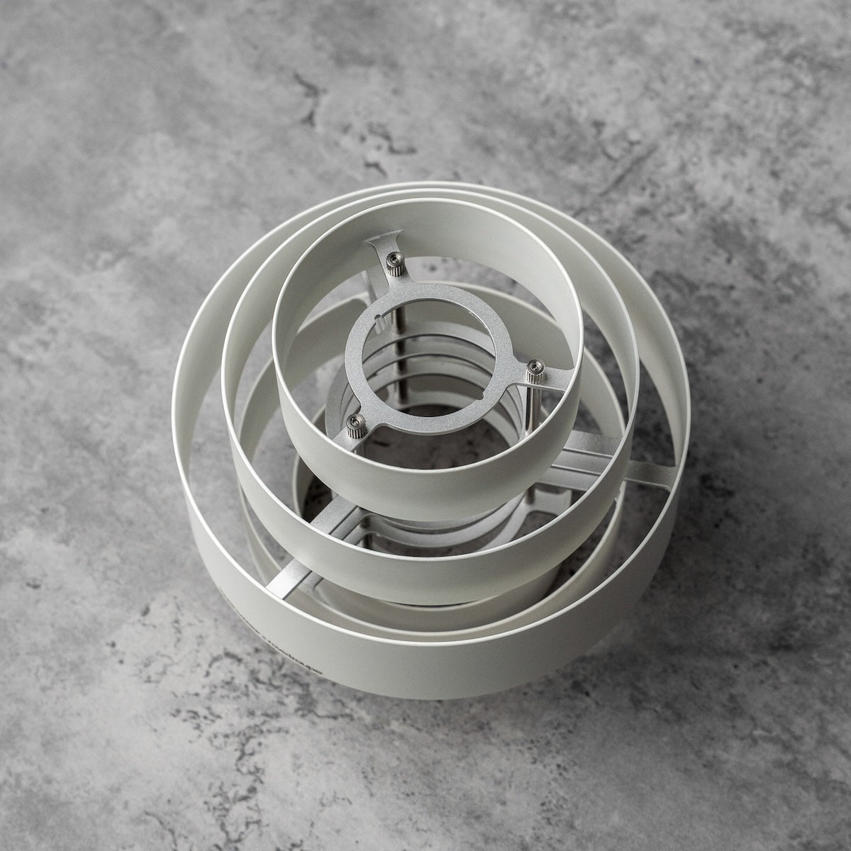 ランプシェードの形状は、波紋のように広がる音波を連想させ、光と音が空間で自然に広がる様子が表現されています。