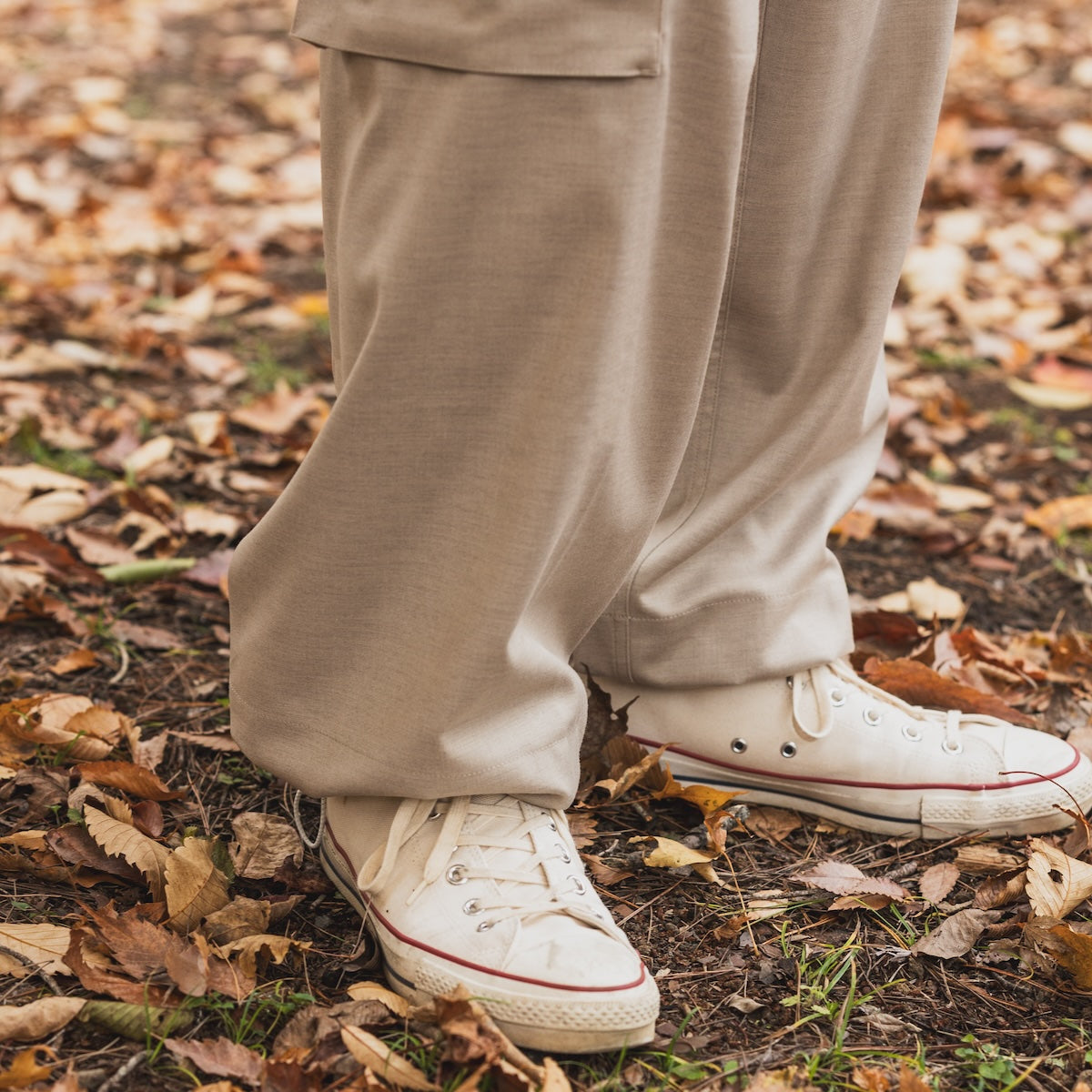 絞ってアクティブな雰囲気に、ワイドでモードな印象に、ダブルに折ってくるぶし丈で履いたり、と裾の見え方は3通り楽しめます
