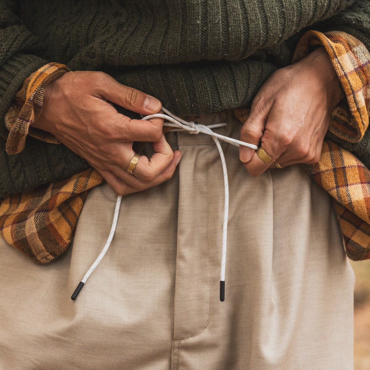 裾についているドローコードで裾幅を調節することで、同じパンツでも全く違った表情を見せる事が出来ます
