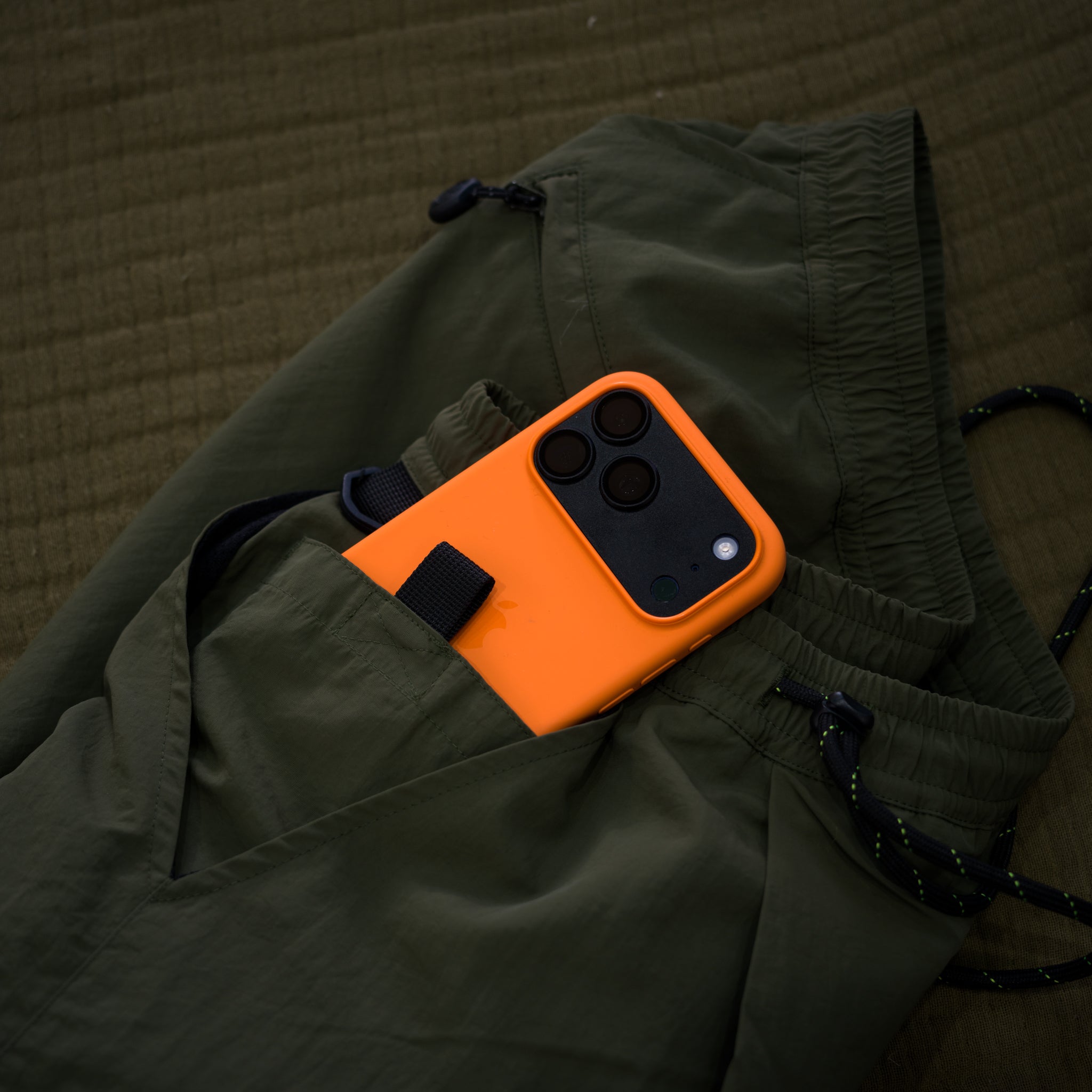ウエストの紐を真ん中ではなくサイドに持ってくることにより垂れていても邪魔にならないようにしています。