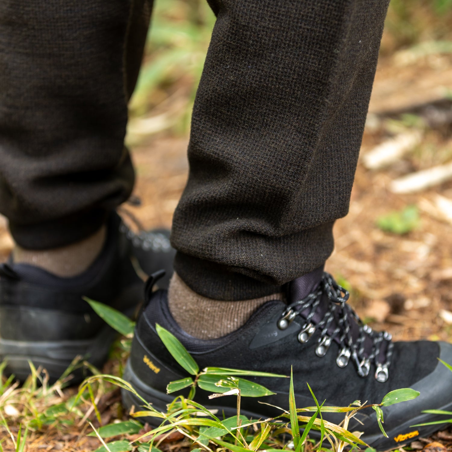 伸縮性の強いリサイクルポリエステルを並べて編み込むことで動きやすさ、着脱しやすくなります。加えて強度もUP。ポケットが無縫製の編み続きであることもポイントです。ステッチの補強あり。