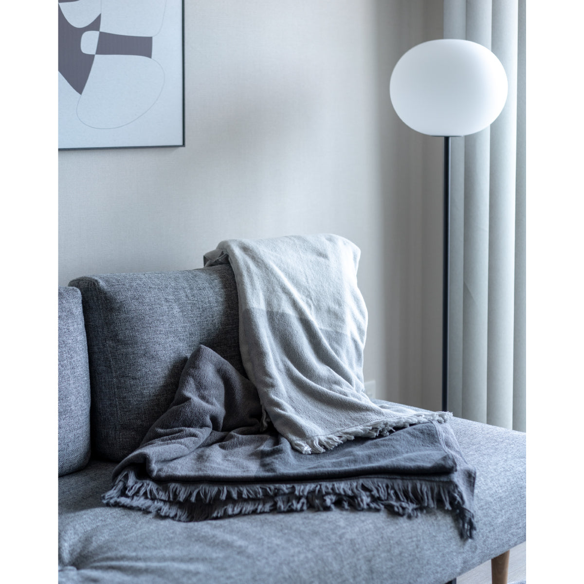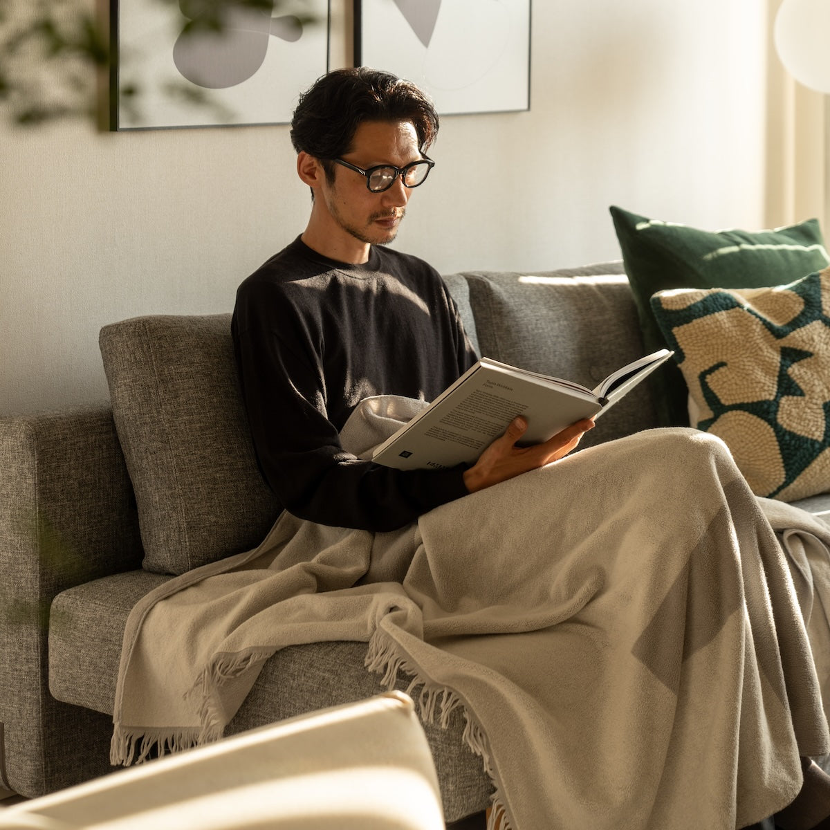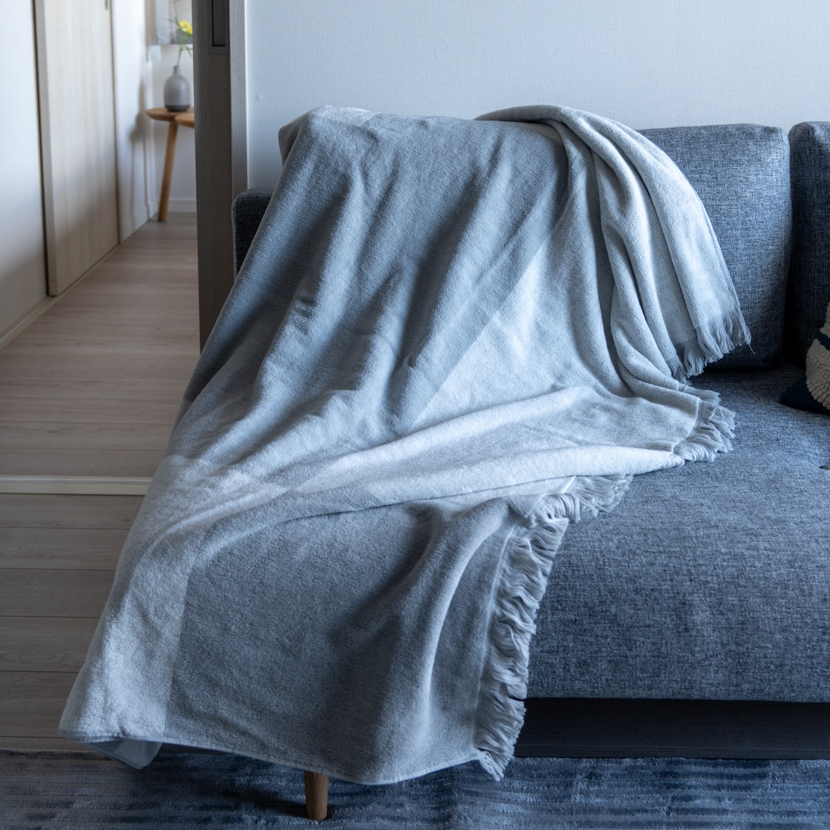 スロー(THROW)とは、ブランケットよりも薄手で大判で、肌寒い時に羽織ったり、インテリアのアクセントとして使われる、欧米発祥の布です。
