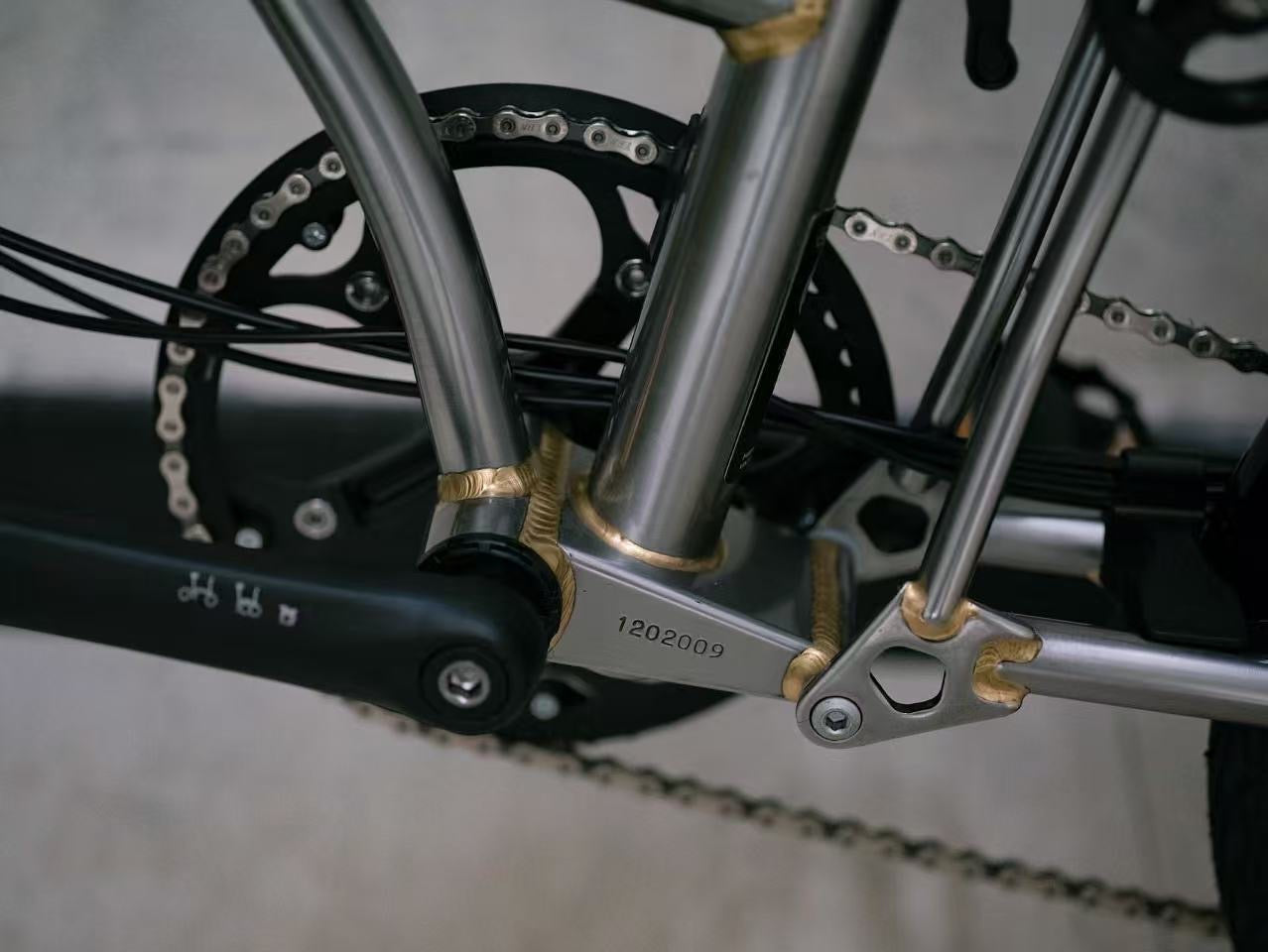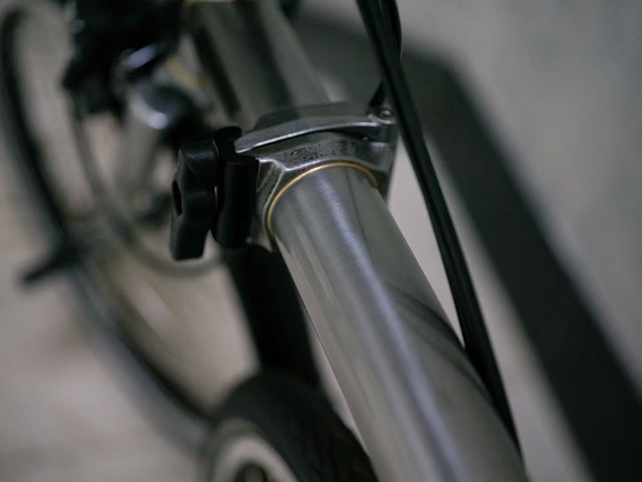 BromptonのCライン 12-speed をベースにカスタムしています。車体をばらし、塗装を 全て剥がして素地が見えた状態で透明のクリア塗装をしたRAWカラーver。溶接の跡など一台一台に個性が宿る仕上がりです。オリジナルのベル付き。