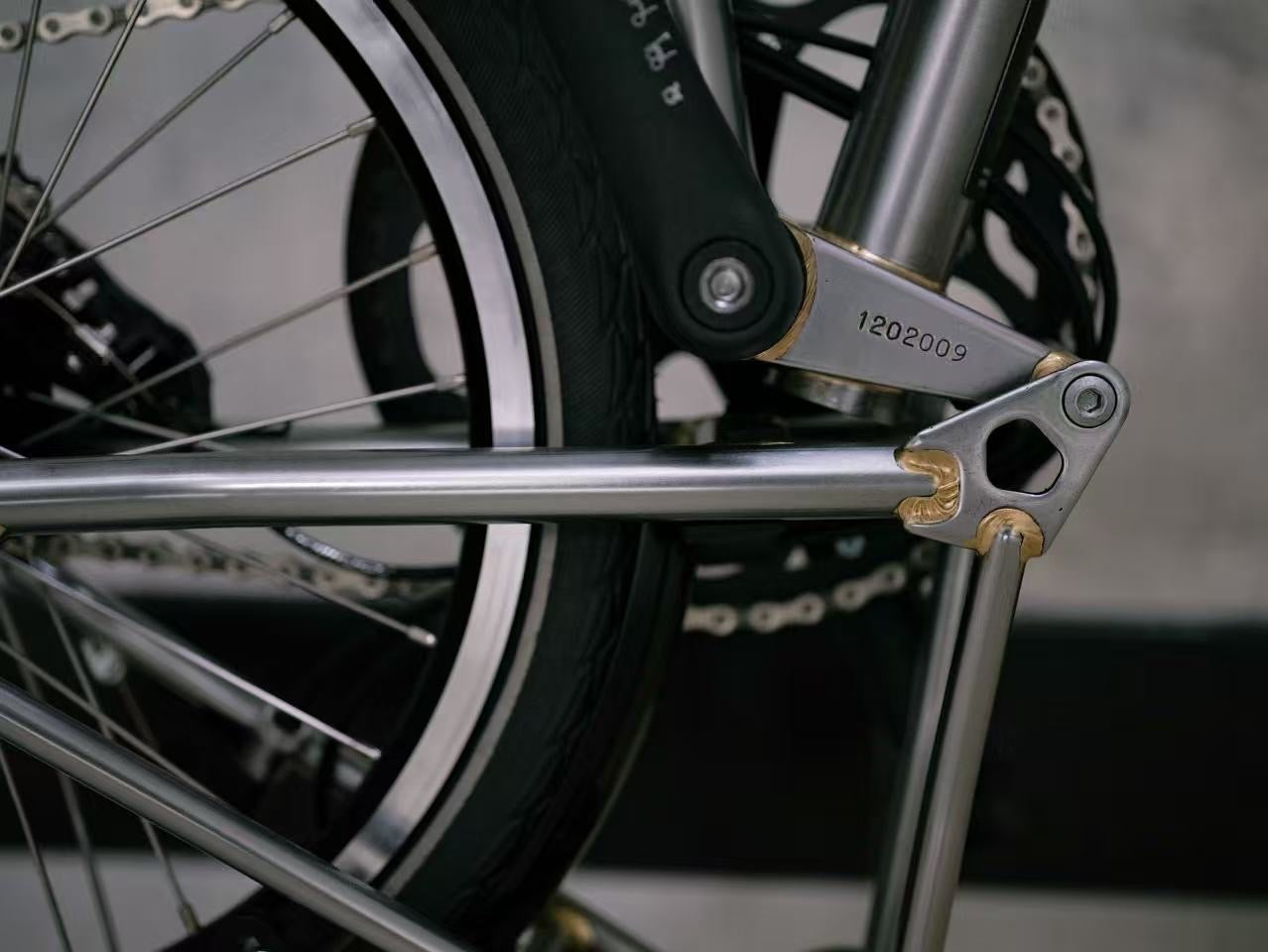 *塗装を剥がしてクリア塗装をするため、素地の傷や小さな錆などがあります。綺麗な塗装面をお求めの方は、通常塗装されたBromptonをお求めください。