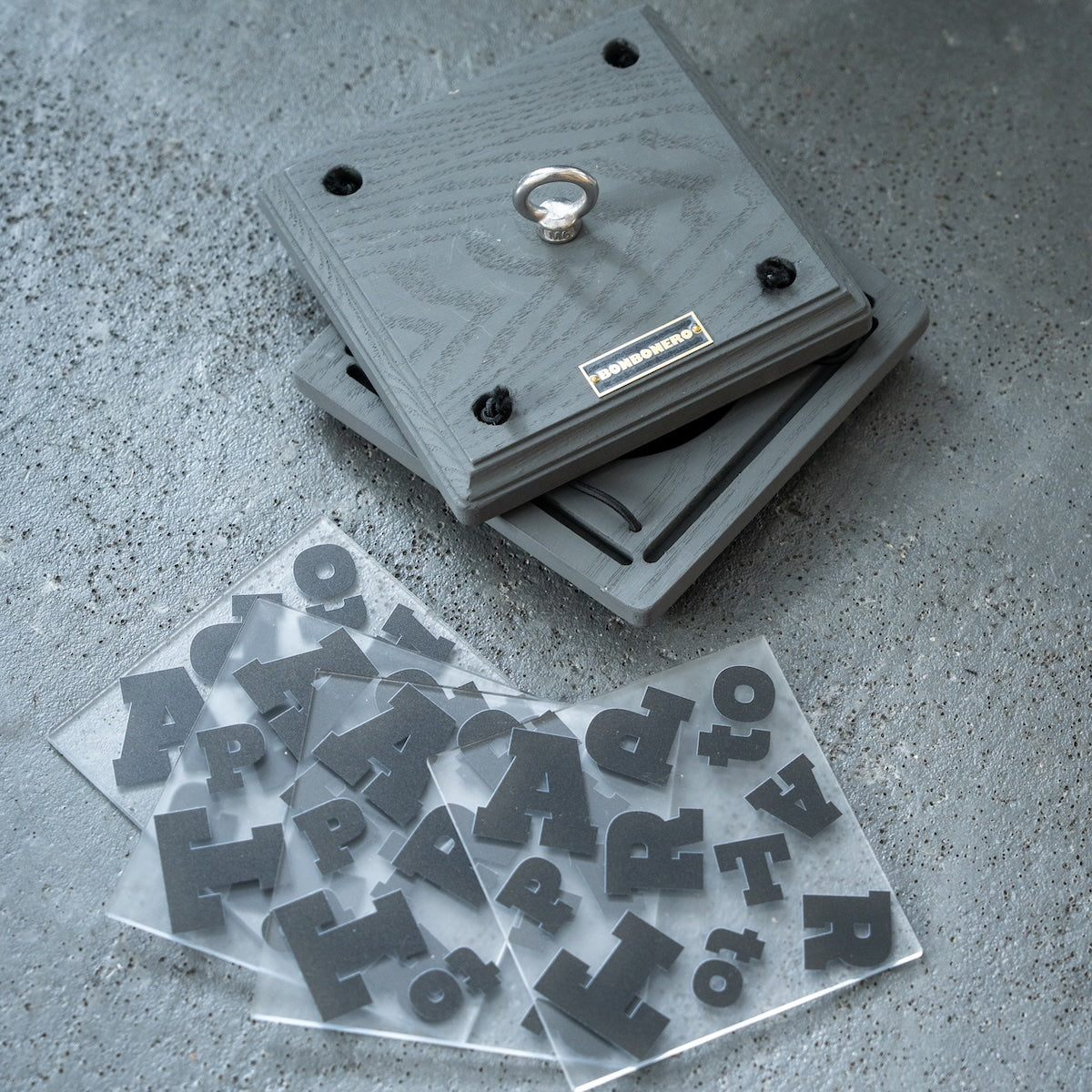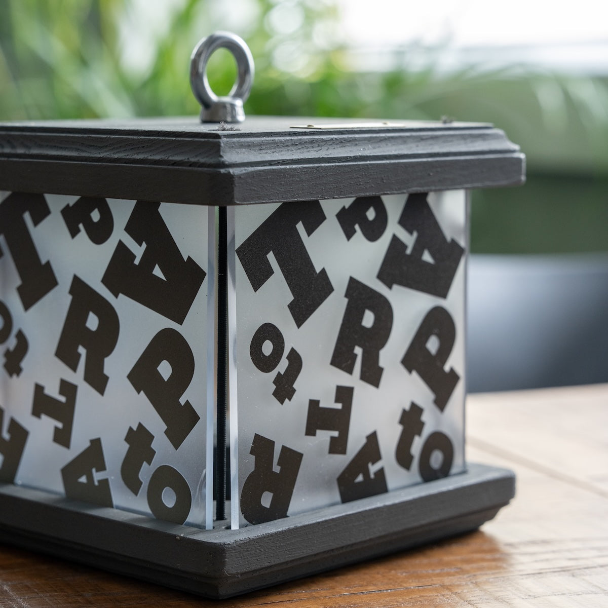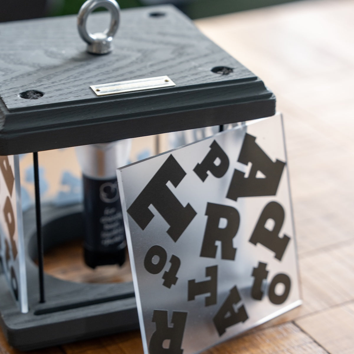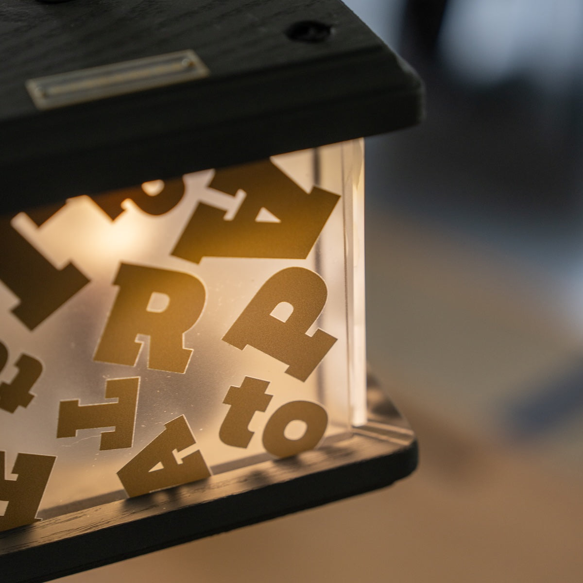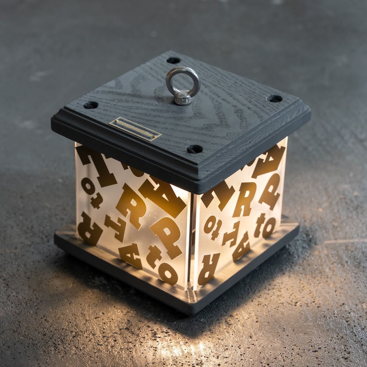 木製の上下パーツとTARPtoTARPのオリジナルグラフィックを配した4枚のパネルから漏れる光がキャンプサイトを優しく照らす。